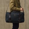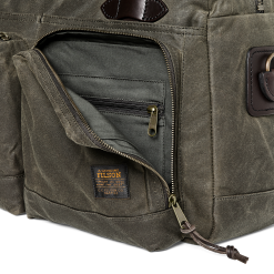 With a 34-liter capacity. our 48 Hour Duffle Bag is ideally sized for a long weekend. It is made from our waxed Tin Cloth. the iconic canvas that’s withstood the elements in rain-soaked backlands for a century. The main compartment is fully lined with unwaxed cotton to protect clothing and gear. The Bridle Leather handles are thick and strong for lasting service. Exterior zippered pockets keep quick-access essentials close at hand. The trolley strap on the back slides over the handles of rolling luggage for ease in navigating airport security. This bag meets airline carry-on size requirements. but if you do check it. the shoulder strap detaches to avoid snagging.