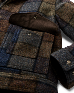 Our Mackinaw Wool Work Jacket design is streamlined. cut to hip-length to avoid riding up when seated and for easy access to pockets or a tool belt. Virtually indestructible custom snaps for the front closure and adjustable cuffs are easy to operate even when wearing gloves. Handwarmer pockets lie behind the snap-flap cargo pockets. The left-side exterior features a layered accessory pocket and the interior an open-stow pocket.