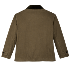 A relaxed garment for every walk of life. this jacket blends design simplicity. expert construction. and iconic materials. It is made with dry finish Tin Cloth. the unwaxed version of our signature fabric that is famous for its durability. The warm cotton-flannel lining is brushed for softness and comfort. Button-secure front closure and adjustable cuffs. Corduroy-lined collar.