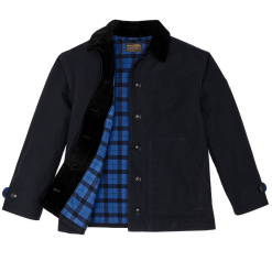 A relaxed garment for every walk of life. this jacket blends design simplicity. expert construction. and iconic materials. It is made with dry finish Tin Cloth. the unwaxed version of our signature fabric that is famous for its durability. The warm cotton-flannel lining is brushed for softness and comfort. Button-secure front closure and adjustable cuffs. Corduroy-lined collar.