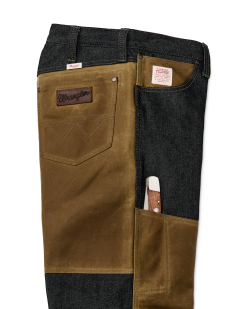 These authentic work jeans are made for tough jobs and wet conditions. They’re made with Wrangler’s rugged. time-proven 14.5-oz denim and reinforced with our Tin Cloth for water resistance and added durability. The reinforcements combine design elements of our iconic Double Tin and Brush Pants–the seat. rear hems. leg fronts all double-layered with our signature waxed canvas. The fit is relaxed with a gusseted crotch for comfortable ease of motion. A seventh belt loop in the back center prevents waistband sagging. Open-stow and flap-covered rear pockets. Zipper fly.