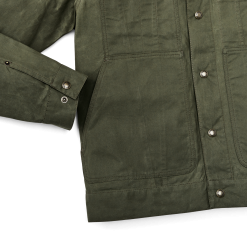 The Ranger Short Cruiser leverages our century of experience in manufacturing quality waxed-cotton jackets. Unlined for wear in warmer conditions. it blocks away wind and rain when the weather turns. The dry-wax finish is washable for easy care. The hip-length cut allows easy access to pockets or a tool belt and won’t ride up when seated. Durable metal snaps secure the front and adjustable cuffs. The left chest pocket is flap-covered. and the right slotted for penlights or pencils. Large hand pockets are reinforced with bar-tack stitching for strength.